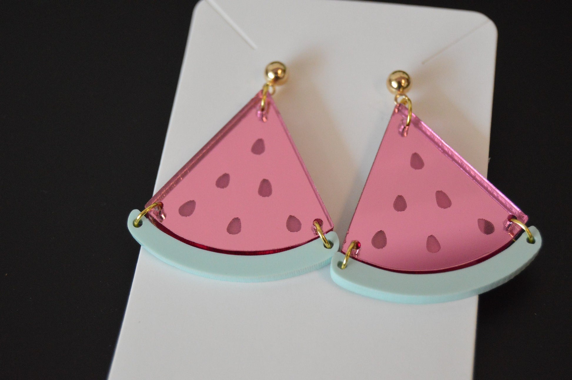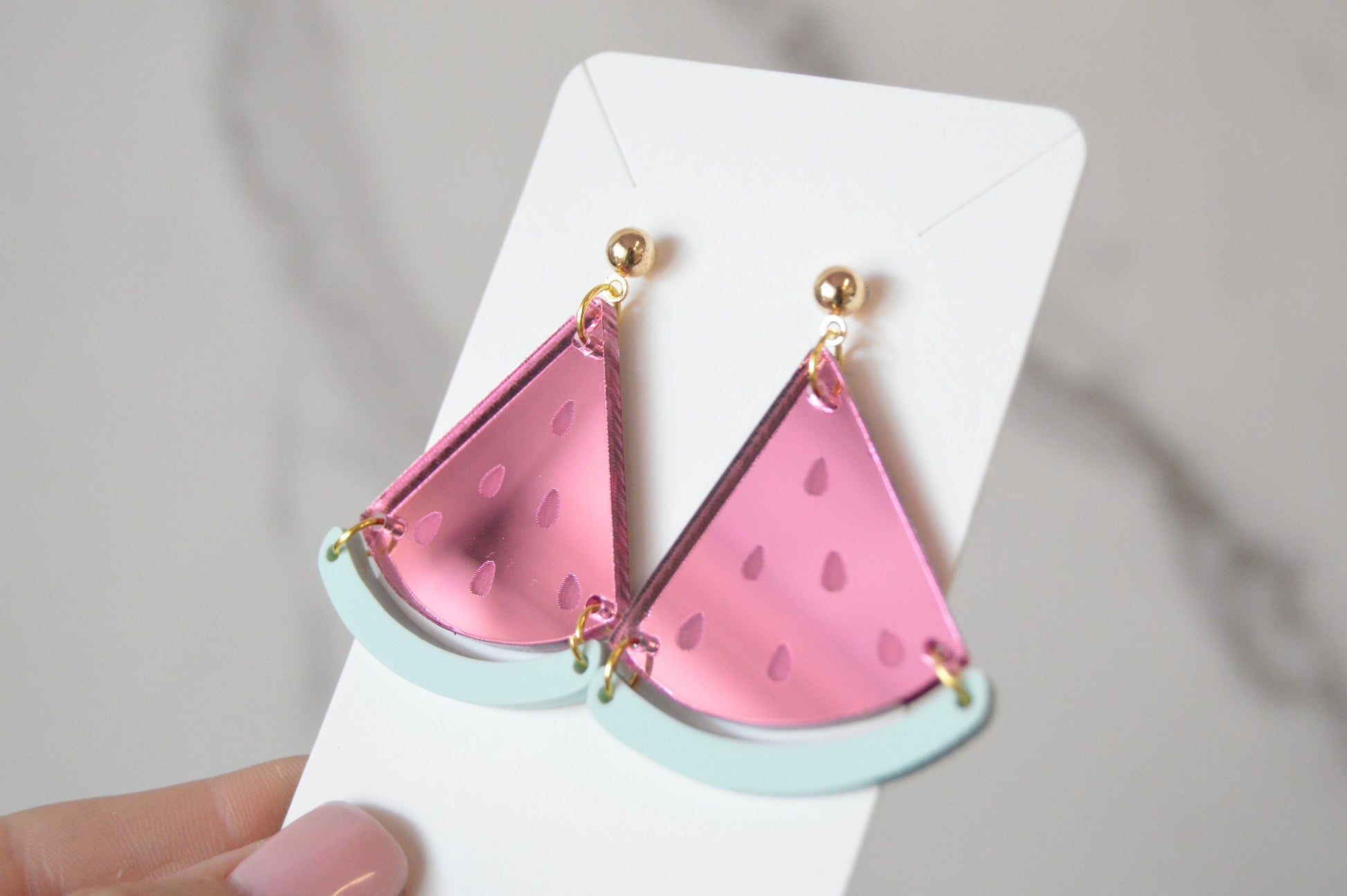 This set of watermelon dangles showcases a beautiful pink mirror that has been laser engraved from behind and is paired with a soft green rind.